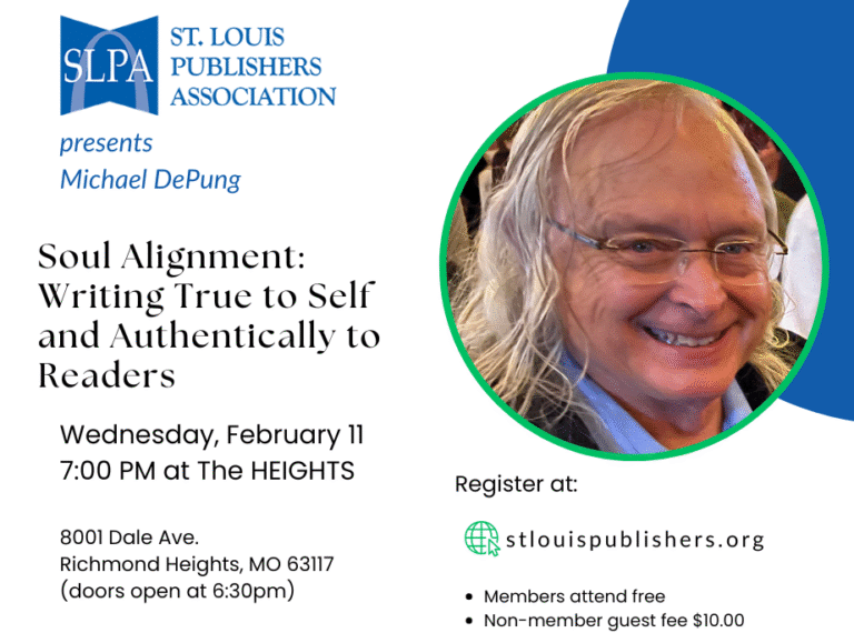 Join the St. Louis Publishers Association on February 11 for this short workshop, we will choose a focus to write a piece aligned with our soul. Then, we will use a framework for developing our soul focus into a published, readable piece that gives us, the authors, joy and offers creative value to our readers.